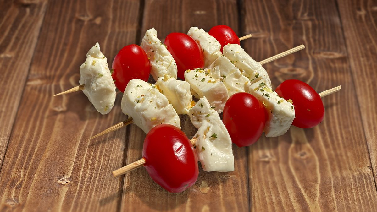 - Enfiler les grains de fromage et les tomates sur des brochettes et les déposer sur une plaque à pâtisserie tapissée d’un papier anti-adhérent.