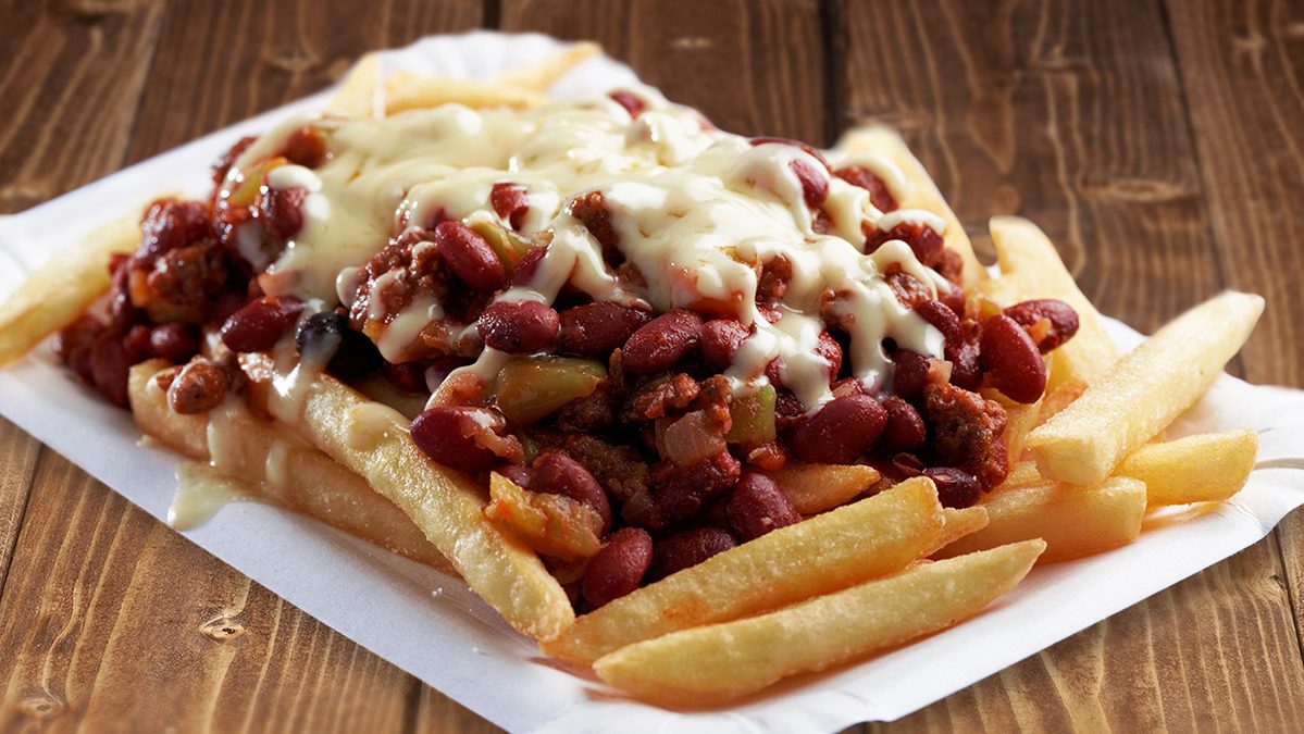 - Verser votre recette de chili préférée sur les frites.