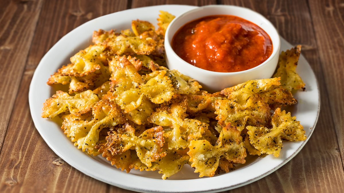 - Cuire dans la friteuse à air préchauffée pendant 5 minutes; retourner et cuire 2 à 3 minutes de plus. Transférer dans une assiette tapissée d’essuie-tout et briser les croustilles de pâtes collées ensemble ; laisser refroidir complètement. Répéter avec les pâtes restantes. Déguster en trempant dans la sauce marinara.
