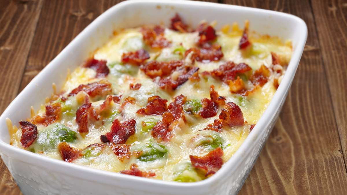- Retirer la casserole du feu et verser la crème. Saupoudrer le fromage suisse Rightrou! sur les choux de Bruxelles. Garnir de bacon émietté et cuire environ 12 minutes ou jusqu’à ce que le fromage soit fondu et bouillonne.