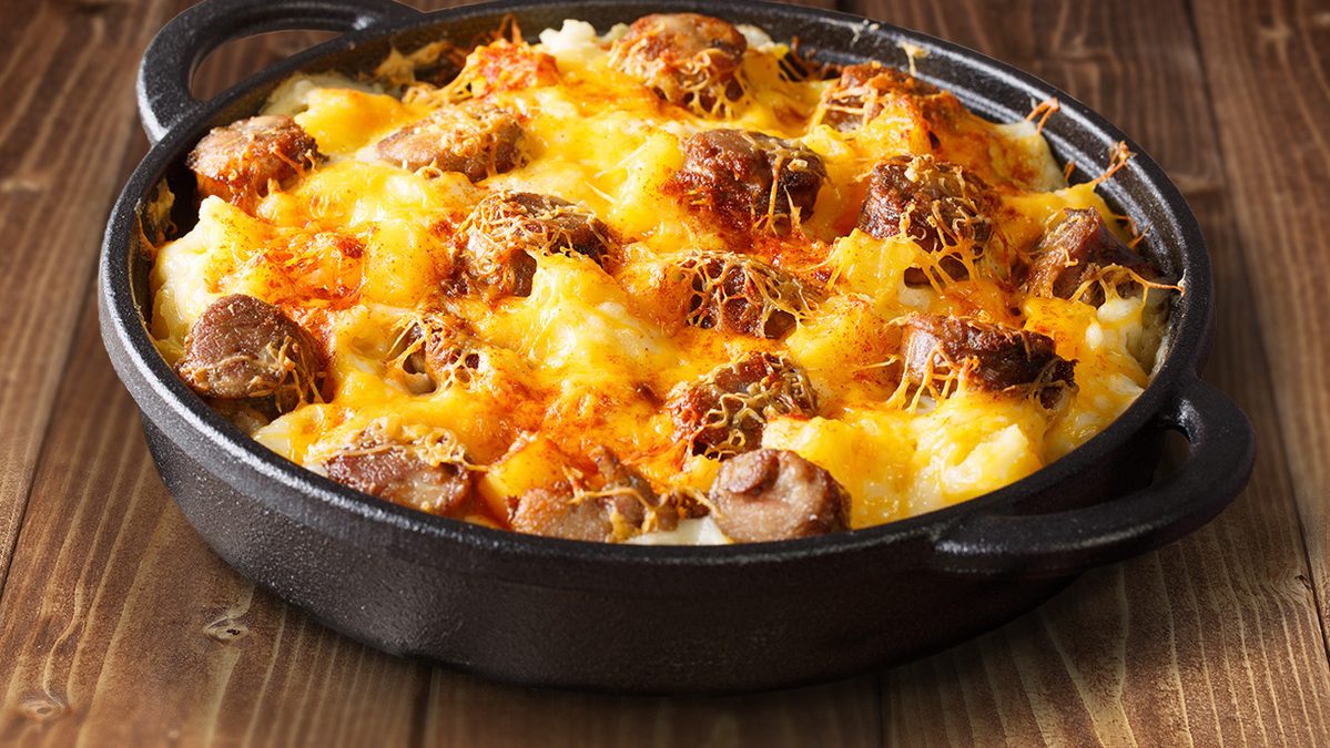 - Dans un plat allant au four, ajouter les pommes de terre rissolées, les saucisses cuites, l’oignon, le poivron et 1 ½ tasse de fromage cheddar Tiguidou!. Mélanger délicatement les ingrédients et répartir uniformément dans le plat.