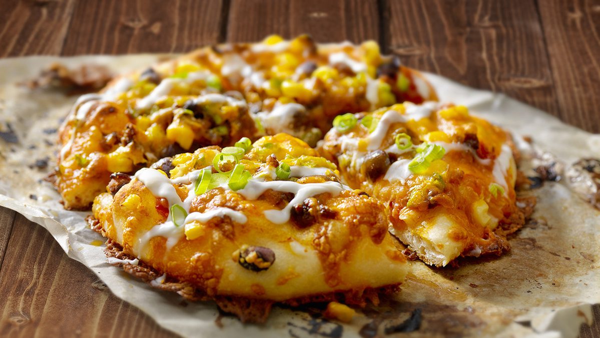 - Assembler les pizzas. Placer la croûte précuite sur une plaque à pâtisserie ou une plaque à pizza. Étendre une couche du mélange de haricots frits sur la croûte. Garnir de boeuf haché et de fromage Mamamia! et Tiguidou!, des olives et du maïs.