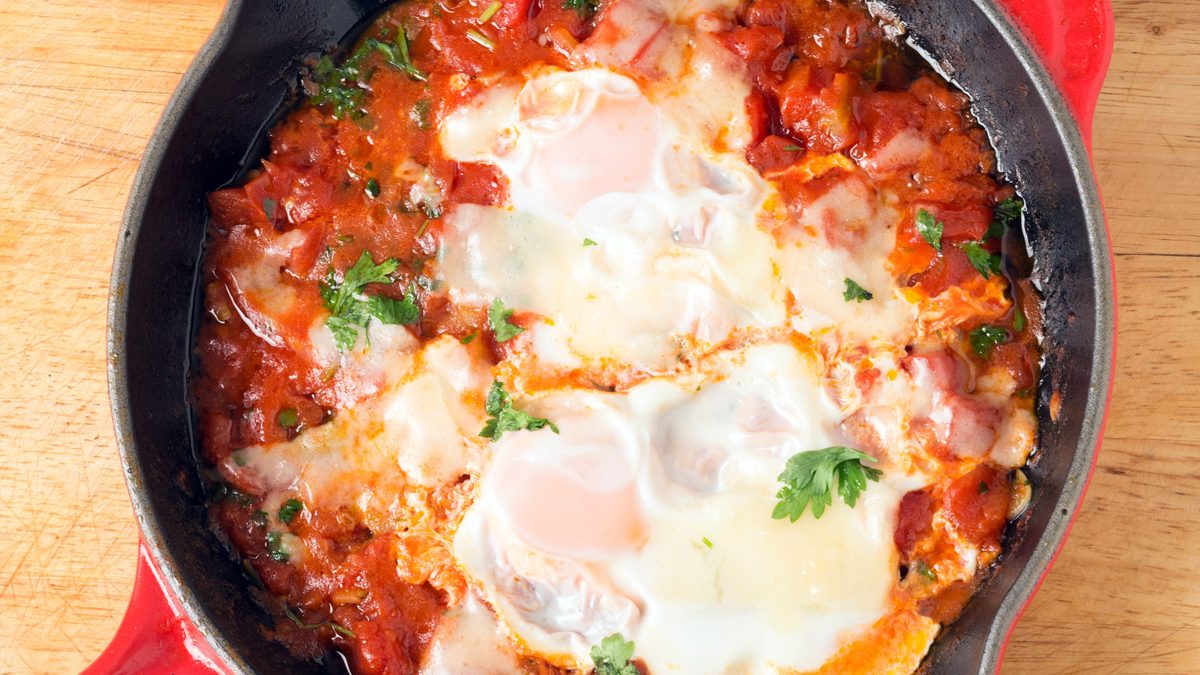 - Casser les œufs un à la fois sur la préparation de sauce tomate. Parsemer de fromage Ayoye! et faire gratiner au four.