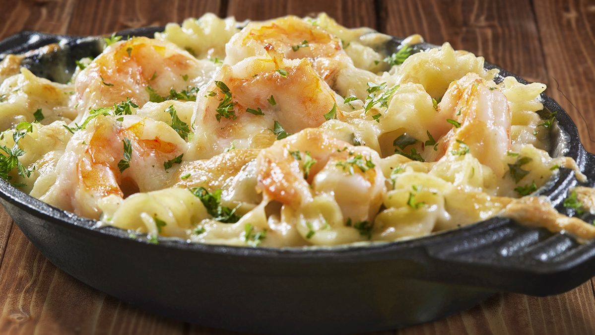 - Le plat est prêt lorsque le fromage est fondu, les crevettes roses et les pâtes tendres.