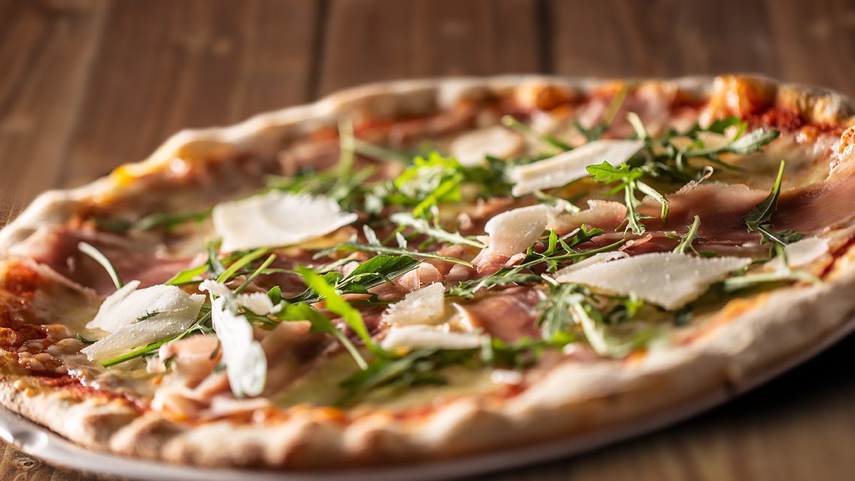 - Après la cuisson, découpez la pizza en deux puis garnissez chaque moitié avec de la roquette et des tranches de Prosciutto en les chiffonnant. Parsemez de copeaux de parmesan et dégustez!