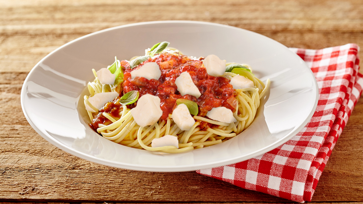 - Servir les pâtes et la sauce et ajouter le fromage en grain Skouik! Skouik! sur le dessus.