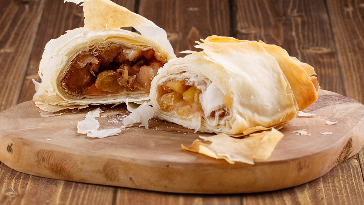 - Déposer 2 feuilles de pâte filo sur le plan de travail; badigeonner d’un peu du beurre fondu restant. Ajouter 2 autres feuilles de pâte filo, en badigeonnant chacune de beurre. Soulever délicatement et placer dans le moule préparé. Tartiner du mélange de pommes; replier la pâte phyllo pour enfermer la garniture. Répéter avec les 4 feuilles restantes. Badigeonner le dessus avec le beurre restant.